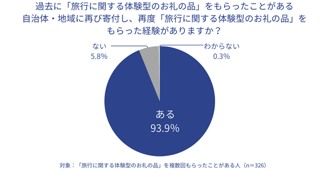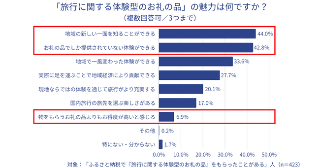 「地域の新しい一面を知ることができる」「お礼の品でしか提供されていない体験ができる」「地域で一風変わった体験ができる」「実際に足を運ぶことで地域経済により貢献できる」点が魅力として評価された。一方、「物をもらうお礼の品よりもお得度が高いと感じる」と回答した割合は6.9%にとどまった。