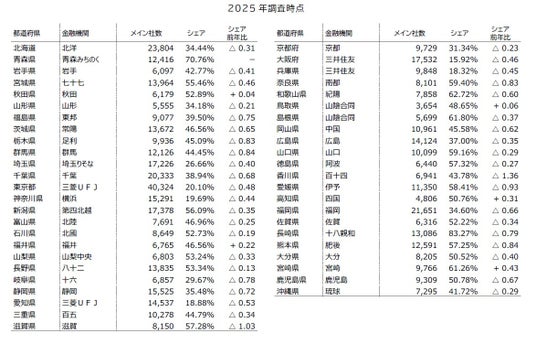1行で県内シェア50%超を占める「単独過半数」の都道府県は合計21に上り、2024年調査から1県増加した。ただ、21県のトップシェア・過半行のうち、約8割を占める17行が前年よりシェアが低下した。