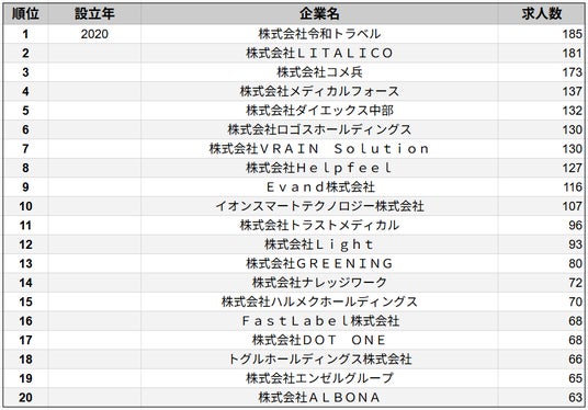 株式会社SalesNow(本社:東京都渋谷区、代表取締役:村岡功規、以下「当社」)は、国内540万社の企業情報を完全網羅した日本最大級のデータベース「SalesNow DB」より、2024年4月1日~2025年4月1日の期間における求人データ(※アルバイト媒体を除く)をもとに、「2020年設立企業」における求人数ランキングTOP20を集計・発表いたしました。