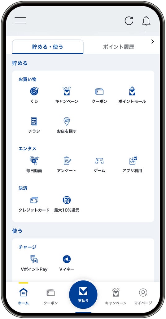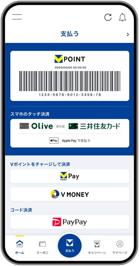 このたび、「支払う」ページを新設し、モバイルVカードの提示に加え、スマートフォンでのタッチ決済に対応しているSMBCグループの『Olive』『三井住友カード』および『Apple Pay』または『Google Pay』、Vポイントをチャージして決済を行うことができる『VポイントPay』『Vマネー』、コード決済に対応している『PayPay』といった各種決済手段を集約しました。これにより、ポイント提示から決済までの操作を一画面で完結でき、よりスムーズで利便性の高いお買い物体験を提供いたします。