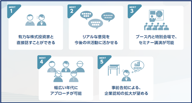 早期申込割引や、上場3年未満の企業のIR活動を促進するための特別割引なども用意されている。市場の活性化を目的として開催しているため、参加しやすい料金設定となっており、IRの活動予算が限られている企業にもおすすめのイベントだ。その場でのコミュニケーションはもちろんだが、リアルな意見を今後のIR活動に活かすことができる。また、大規模に開催告知を行うため、イベントの事前・事後でも認知拡大が望めるのも魅力だ。