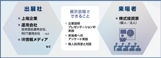 IR・株式投資フェアは、株式投資家と上場企業・運用会社のコミュニケーションの場を創ることを目的として開催する。来場者はもちろん無料で参加が可能だ。出展社は、上場企業を中心として、投資信託・REITの運用会社、IR情報メディアなども対象となる。出展社は、ブース内でのミニプレゼンや、相談席での個人投資家との対話、特設会場でのセミナー講演の実施などにより、個人投資家とコミュニケーションを行う。