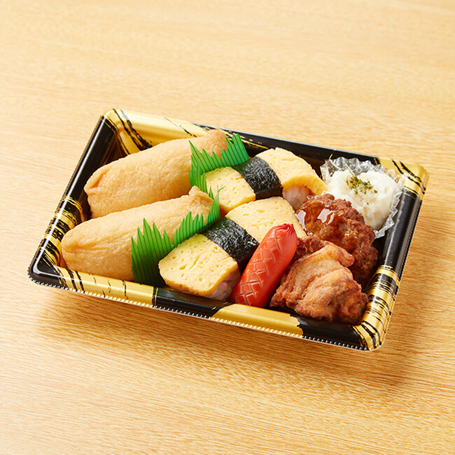 【内容】だしの風味が感じられる、明るい色目で柔らかい食感のいなり寿司に、玉子寿司と人気のおかずを加えたお寿司のセットです。