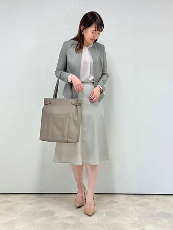 肌なじみの良い柔らかなベージュ系のアイテムを組み合わせて、通勤スタイルを春らしくアップデート。ベージュとブラックの千鳥柄を配したジャケットは、全体の優しい配色にメリハリを与えてくれます。インナーは淡いピンクのブラウスで上品に。襟元のギャザーデザインが、すっきりとしたノーカラージャケットを華やかに演出します。