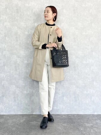 ベージュ、アイボリーの優しいトーンをブラックで引き締めたオンオフ兼用スタイル。重たい印象を避けたい春の着こなしは、濃色をポイント使いすることですっきり見えも叶います。主役は繊細なカットワークをあしらったレザーバッグ。型抜きのモチーフから覗くインナーの巾着はハウスタータン柄で、さりげなく華やかさをアップしてくれます。