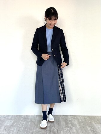 ネイビーブレザーに明るいブルートーンをプラスして、定番のトラッドスタイルをアップデート。ダンガリーとハウスタータンをドッキングした、新鮮なデザインのキルト風スカートがポイントです。トップスは爽やかなサックスブルーのニットをチョイス。ジャケットの堅い印象を抑え、春らしさを感じさせる着こなしです。