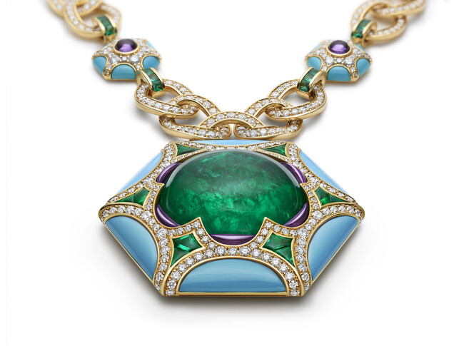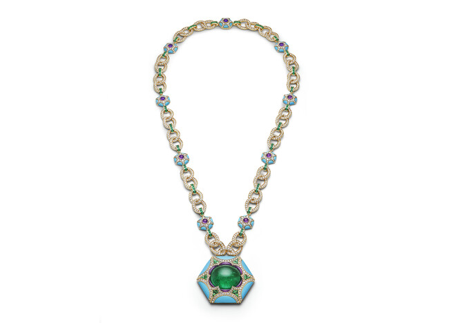 ローマの悠久の建築を思わせる「Roman Esedra(ローマン エセドラ)」のソートワールは吸い込まれそうな68.88カラットのエメラルドが六角形のペンダントに嵌めこまれています。70年代のアイコニックなブルガリピースをオマージュしたこのネックレスは、エメラルドからアメジスト、ターコイズまで、幅広い種類の宝石の調和のとれた組み合わせが特徴です。今回イエローゴールドのチェーンで再現した独特な色の組み合わせは地中海の華やかさに根付いたブルガリならではの溢れんばかりの快活さを反映しています。