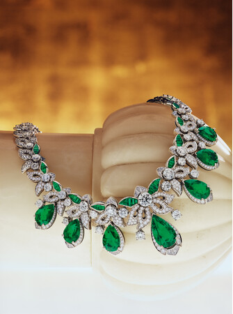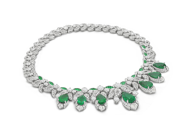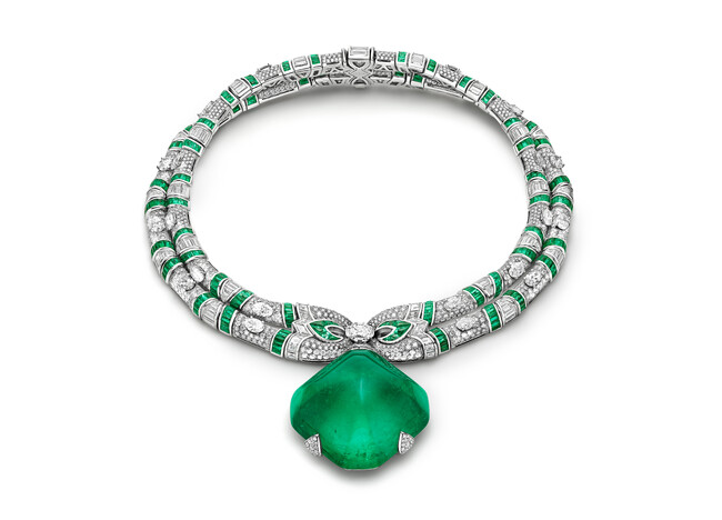 ブルガリのローマ本店からほど近くにあるアラ・パチスを飾る見事なレリーフがモチーフになったのが「Acanthus Emerald (アカンサス エメラルド)」ネックレスです。絶妙にバランスの取れたレイアウトを作るため、どれも優れた色合いと透明度を持ち、合計で33.59カラットにもなる7個の上質なエメラルドをドロップシェイプにカットして、60個のバフトップカットエメラルドとともにセットし、68個のステップカットダイヤモンドと58個の