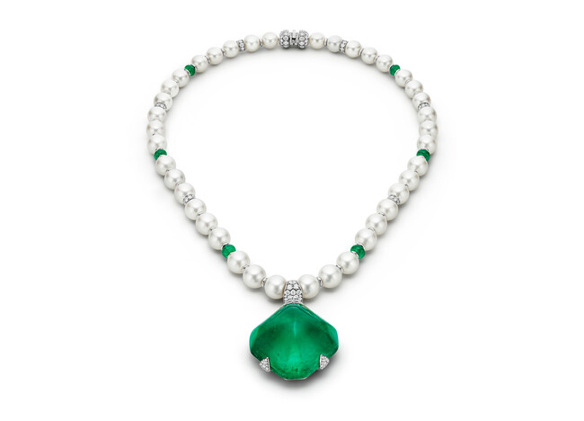 ローマという都市を特徴づけてきた永遠の美の感覚が「Muse of Rome(ミューズ オブ ローマ)」ネックレスにも息づいています。息をのむほど見事なエメラルドは218.53カラットもあるため、ブルガリのジュエリー クリエイティブ ディレクターを務めるルチア・シルヴェストリは空気のような軽さと宝石の重みのバランスをとりながら、同時にその類まれな魅力を引き出すというこれまでにないデザインを考えなければなりませんでした。そこで2名の匠の助けを借りて、取り外し可能な中央のペンダントを優雅かつ洗練されたデザインで強調する独特の構造を生み出しました。ピースにさらにモダニティをプラスするため、エメラルドと南洋真珠のソートワールをデザインし、さまざまな身につけ方ができる多機能なクリエイションにしました。