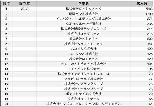 株式会社SalesNow(本社:東京都渋谷区、代表取締役:村岡功規、以下「当社」)は、国内540万社の企業情報を完全網羅した日本最大級のデータベース「SalesNow DB」より、2024年4月1日~2025年4月1日の期間における求人データ(※アルバイト媒体を除く)をもとに、「2022年設立企業」における求人数ランキングTOP20を集計・発表いたしました。