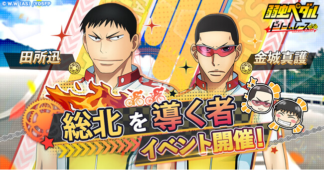 『弱虫ペダル ドリームレース』にて、総北を導く先輩2名が登場するピックアップイベントを開催します。総北ジャージ姿の金城真護と田所迅が限定キャラクターとして登場します。イベント期間中は、イベント限定のレースやストーリーを楽しむことができます。詳細はゲーム内にてご確認ください。