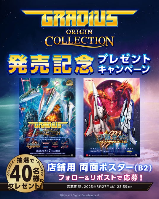 『グラディウス オリジン コレクション』発売を記念して、SNSキャンペーンを開始!KONAMI公式X(@KONAMI573ch)をフォローして、対象のポストをリポストしていただいた方の中から、抽選で40名様に店頭用両面ポスター(B2サイズ)をプレゼントします。
