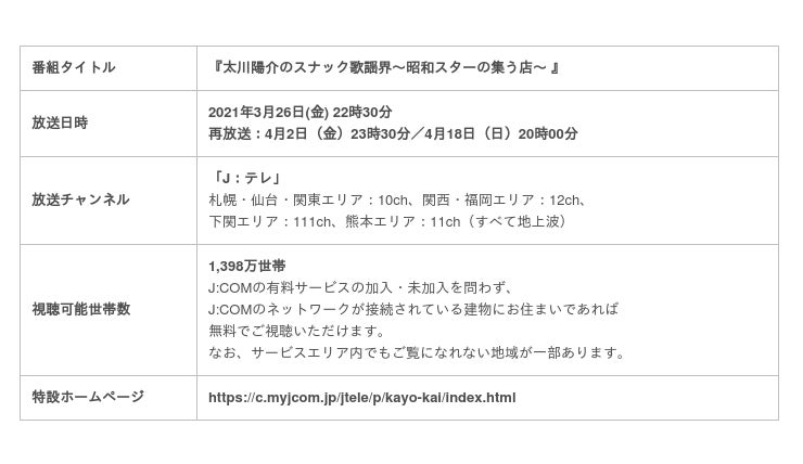 株式会社ジュピターテレコム(J:COM、本社:東京都千代田区、代表取締役社長:石川 雄三)は、特別番組『太川陽介のスナック歌謡界~昭和スターが集う店~』を全国1,398万世帯で視聴可能なJ:COMのコミュニティチャンネル「J:テレ」で、2021年3月26日(金)に放送します。