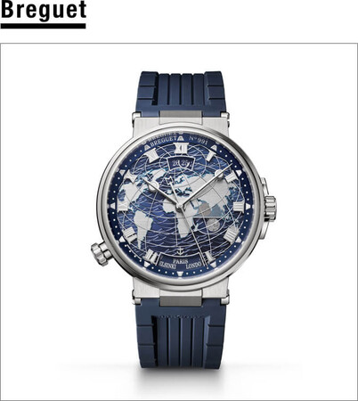 「ブレゲ」マリーン オーラ・ムンディ5557 9,988,000円 ムーブメント:自動巻き/防水性能:10気圧/ケース素材:18金ホワイトゴールド/文字盤:ブルー仕上げ18金ダイヤル(手彫りギョーシェ模様)/サファイアプレートダイヤル/ケースサイズ:径43.9mm/ストラップ:アリゲーター〈型番:5557BBYS5WV〉