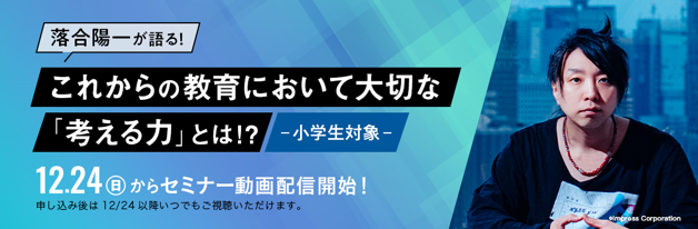 第1回は、ゲストにメディアアーティストの落合陽一氏と花まる学習会代表・高濱正伸先生を迎え、「落合陽一が語る!これからの教育において大切な「考える力」とは?」を、12月24日(日)より進研ゼミ特設サイトと東日本放送(宮城県)で放送します。進研ゼミ会員以外の方も視聴可能です。