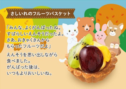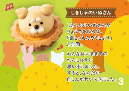 「いぬねこ楽団の音楽会」の物語を1枚の絵本風リーフレットにしました。お話とプチケーキがページごとに載っており、みんなで物語を読みながらプチケーキをお楽しみいただけます。ストーリーや挿絵などの制作すべて当社社員が手掛けています。