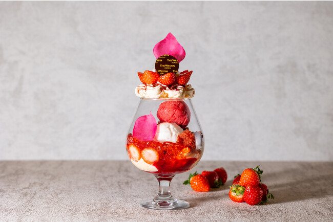 季節のフルーツや食材が持つ美味しさを最大限に引き出したパティシエのイマジネーション光るシーズナルパフェ。今回は、真っ赤に実った「いちご」を使用しました。果汁たっぷりのフレッシュいちごのほか、なめらかないちごのムースや、いちごのソルベに加え、シャンパンジュレやマスカルポーネ―チーズのクリーミーなアイスクリームなど11種類のアイテムがグラスを彩ります。トップにはバラの花びらをあしらい、バラの高貴な香りに包まれた、鮮やかなパフェをお楽しみください。