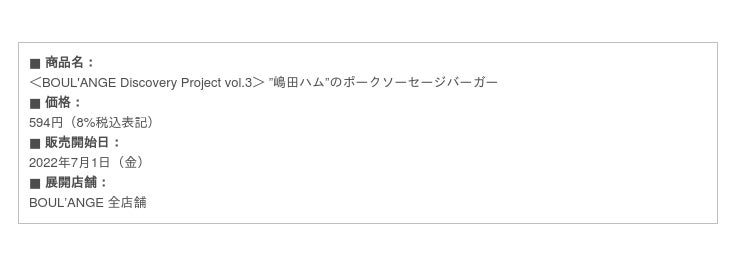 株式会社ベイクルーズ(本社: 東京都渋谷区、取締役CEO: 杉村 茂)が運営する、オリジナルブーランジェリー「BOUL’ANGE(ブール アンジュ)」は、地域活性化プロジェクト「BOUL’ANGE Discovery Project」の第4弾として、株式会社 嶋田ハム(本社: 秋田県大仙市、代表取締役: 花澤 直樹)が提案する「ドイツポークソーセージ」を使用した新作バーガーを7月1日(金)より販売開始いたします。