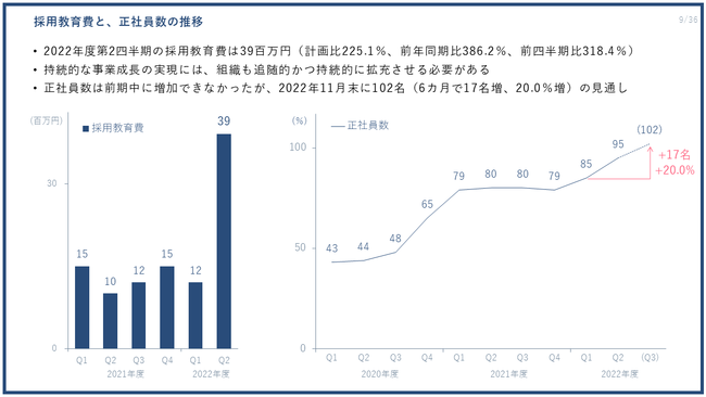 販売管理費の中で、採用教育費も共有させていただきます。2022年度第2四半期では採用教育費に3900万円(計画比225.1%、前年同期比386.2%、前四半期比318.4%)を投じました。持続的な事業成長の実現には、組織も追随的かつ持続的に拡充させる必要があると考えており、正社員数を第1四半期中に増加することはできませんでしたが、第2四半期で10名増加し、2022年11月末に102名(6カ月で17名増、20.0%増)の見通しとなっています。