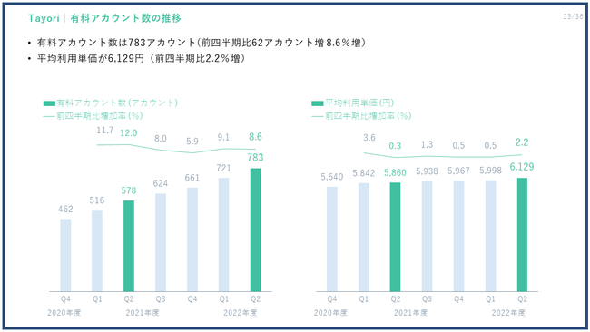 8月末時点の有料アカウント数は783と、前四半期比で62アカウント増となり、順調に有料化が進んでいます。平均利用単価は6129円(前四半期比2.2%増)と利用単価も伸ばすことに成功しています。