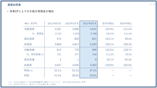 営業キャッシュフローの増加により引き続き現預金が増加しています。ROAとROEを中長期でキープするため、今後この現預金をしっかり投資して、全ての事業で競争優位を築いて、全ての事業で超過利潤を上げられるようにいたします。