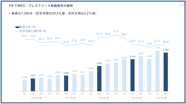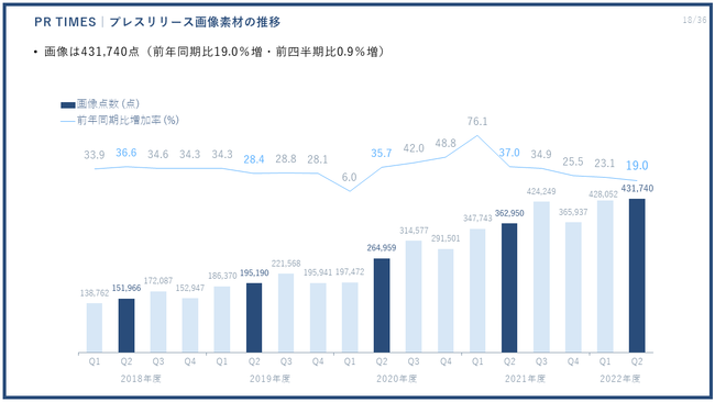 「PR TIMES」のプレスリリースに掲載いただく画像や動画の数については、画像が43万1740点(前年同期比19.0%増・前四半期比0.9%増)、動画が7395本(前年同期比20.4%増・前四半期比5.2%減)となりました。引き続き、プレスリリースのリッチコンテンツ化が進んでいます。
