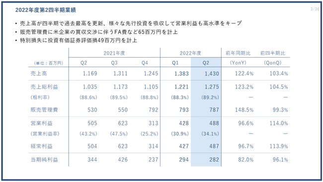 2022年度第2四半期の業績は、売上高 14億3000万円(前年同期比122.4%・前四半期比103.4%)、 営業利益 4億8800万円(前年同期比96.6%・前四半期比114.0%)、 当期純利益2億8200万円(前年同期比82.0%・前四半期比96.1%)となりました。