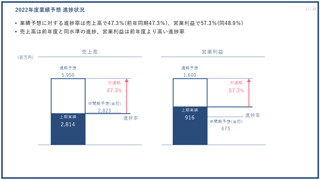 2022年度の通期業績予想に対する進捗率は売上高で59億5000万円に対し47.3%(前年同期47.3%)、営業利益で16億円に対し57.3%(前年同期48.9%)と進捗しております。売上高は前年度と同水準の進捗であり、営業利益は前年度より高い進捗率となっています。