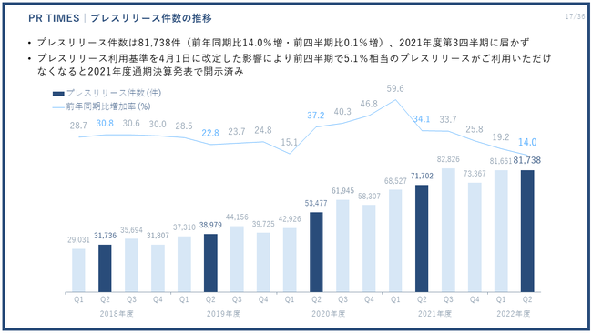 2022年度第2四半期は、8万1738件(前年同期比14.0%増、前四半期比0.1%増)のプレスリリースを配信いただきました。4月1日にプレスリリース利用基準を改定した影響によって、前四半期で5.1%相当のプレスリリースがご利用いただけなくなると前回決算発表で開示しています。第1四半期は1カ月間が対象となりましたが、第2四半期は全期間影響範囲となっています。