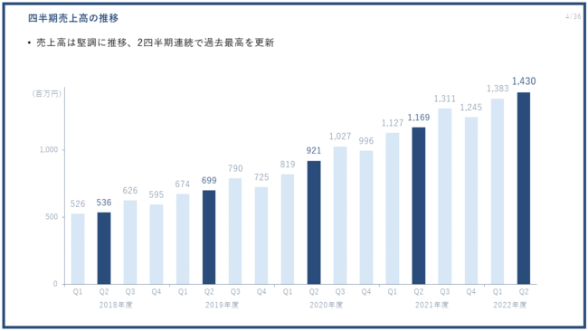 四半期売上高の推移においては、堅調に成長基調を継続しており、第2四半期は2四半期連続で過去最高の四半期売上高を更新しております。
