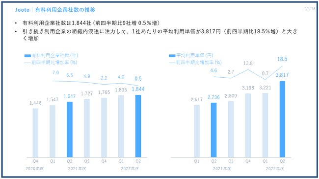 8月末時点の有料利用企業社数は1844社で、前四半期比で9社増に留まりました。引き続き、利用企業の組織内浸透に注力しており、1社あたりの平均利用単価が3817円(前四半期比18.5%増)と大きく増加しました。引き続き、利用社数と利用単価の両方を追っていく方針です。