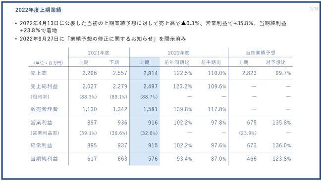 2022年度上期業績は、売上高 28億1400万円(前年同期比122.5%・前半期比110.0%)、売上総利益 24億9700万円(前年同期比123.2%・前半期比109.6%)、営業利益 9億1600万円(前年同期比102.2%・前半期比97.8%)、純利益5億7600万円(前年同期比93.4%・前半期比87.0%)となりました。