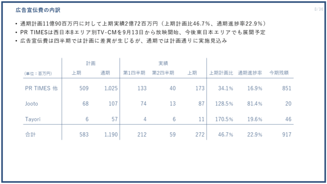 今期は広告宣伝費に11億9000万円を投じる見通しだと示していますが、上期実績は2億7200万円となりました。上期計画に対して46.7%、通期計画に対する進捗率は22.9%となっております。PR TIMESなどの進捗率が16.9%となりましたが、西日本8エリア別TV-CMを9月13日から放映開始しています。今後東日本エリアでも展開予定ですので、四半期では計画に差異が生じますが、通期では計画通りに実施見込みです。