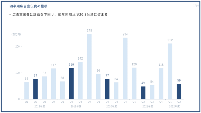 S&Mの中で、広告宣伝費は計画を下回る投資となり、四半期広告宣伝費は5900万円、前年同期比20.8%増に留まりました。