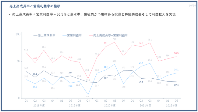 今期2022年度は投資期であるものの、売上高成長率と営業利益率の合計は56.5%と、2019年度と同じ水準をキープしています。