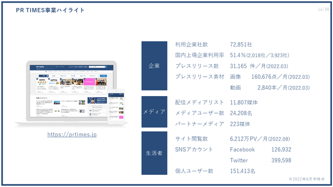 プレスリリースの配信メディアリストは1万1807媒体、情報収集のために会員登録するメディアユーザー数は2万4208名、プレスリリースを転載するパートナーメディアは223媒体になりました。 サイト閲覧数は、2022年8月に過去最高の月間6212万PVを記録し、「PR TIMES」のFacebookの公式アカウントのフォロー数は12万6932人、Twitterのフォロワー数は39万9598人となっております。個人ユーザー数は15万1413名となりました。