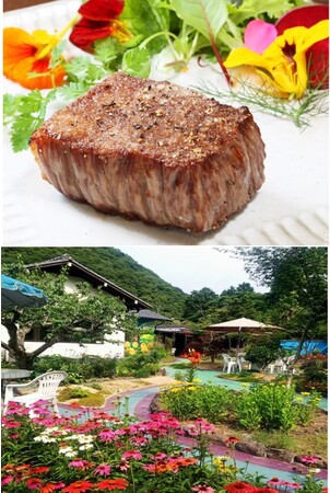上郡町内産の上質な黒毛和牛を遠赤効果の高い手造りセラミックス窯で焼き上げ、外はこんがり中はジューシーに仕上げた、肉本来の味が堪能できる極上のステーキコースを提供。一年を通して花いっぱいで埋め尽くされる庭園は、オーナーの手造り。ゆったりとした時間を過ごすことが出来る特別な空間で食事を楽しめます。