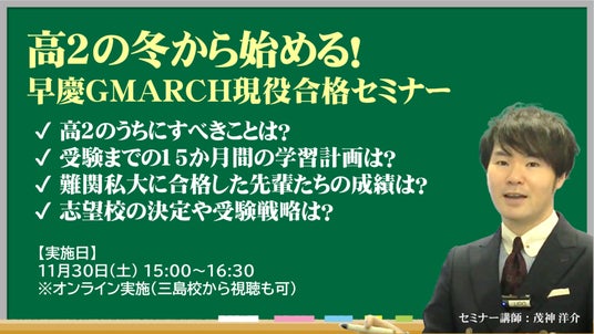 11月30日(土)の「早慶GMARCH現役合格セミナー」は、LiNKSTUDY三島校で参加することも可能です。詳しくは、教室までお問い合わせください。