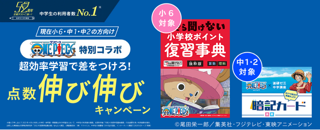 株式会社ベネッセコーポレーション(本社:岡山県岡山市、代表取締役社長:小林 仁、以下:ベネッセ)の提供する「進研ゼミ中学講座」は、小学6年生の小学校まとめテストや中学1・2年生の学年末テスト、新学年最初の定期テスト高得点を応援する”超効率学習で差をつけろ!点数伸び伸びキャンペーン”の一環として、TVアニメ『ONE PIECE』とコラボレーションした特別教材の無料プレゼントキャンペーンを、1月9日(火)から3月20日(水)まで実施します。