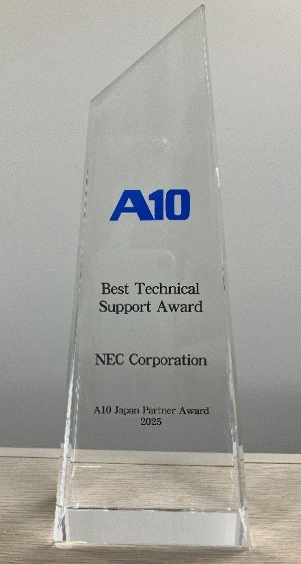 NECはこのたび、A10ネットワークス株式会社(本社:東京都港区、以下A10ネットワークス)が主催する「A10 Japan Partner Awards 2025」において、「Best Technical Support Award 」を受賞しました。この賞は、2025年度(2025年1月~2025年12月)において、高い技術力と柔軟なサポートでお客様満足度向上に大きく貢献したパートナーに贈られるものです。