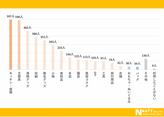 こちらは複数回答にていただいています。1番多かったのは「キッチン・食器」で597人となっています。僅差で2番目に多かったのが「文房具」で590人です。そして「清掃グッズ」が462人と続いています。いずれも日常生活に密着した製品を購入することが多いようです。