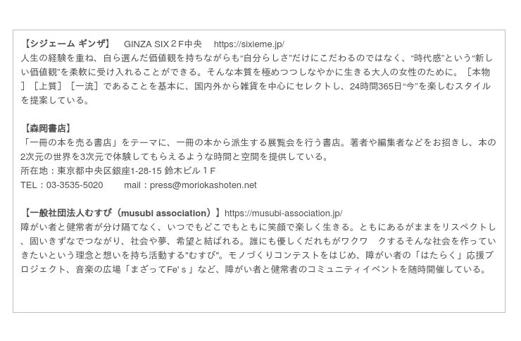 大丸松坂屋百貨店は、ステークホルダーの皆様と協力し、関わりの拠点である店舗において持続可能な社会への様々なアプローチに取り組んでいます。 SIXIÈME GINZA の今回の企画では、すべての人々がより互いの多様性を認め、個性を柔軟に発揮できる社会の実現を目指すものとして、障がいを持つ方々の雇用促進サポートの一助となればという思いから、障害を持ちながら働く人達の支援プロジェクトである「一般社団法人むすび(musubi association)」と取り組みました。