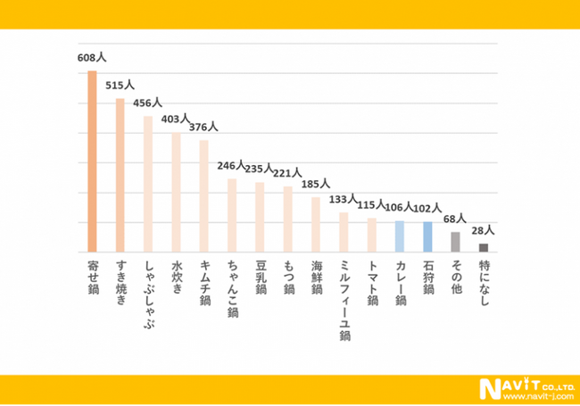 好きな鍋料理のトップ(複数回答可)は「寄せ鍋」で608人。次に多いのが「すき焼き」で515人、「しゃぶしゃぶ」456人、「水炊き」403人という結果でした。