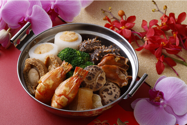 『盆菜』は、大きな鍋に肉や海鮮を贅沢に盛り合わせた伝統的な料理で、春節祭をはじめとするお祝いの席でご馳走としてふるまわれるものです。龍天門では、干し鮑や牡蠣、ナマコ、海老など縁起が良いとされる高級食材を中心に12種類の食材を盛り合わせました。また1月21日(土)には、ご自宅でお楽しみいただけるようテイクアウトもご用意いたします。