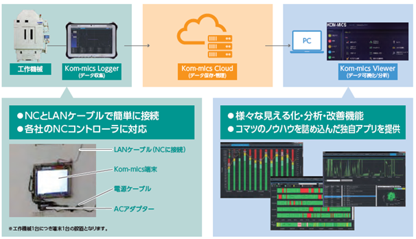 Kom-micsは、工場に設置されている工作機械などの生産設備からデータを収集し工場の現状を見える化することで、生産現場の問題点の洗い出しや改善、品質および生産性の向上を支援するシステムです。