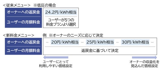 従来のメニュー[*2]ではオーナーへの返戻金を固定単価とし、ユーザーが月額料金プランを選択することが可能ですが、新料金メニューでは返戻金の単価をオーナーのニーズに応じて決定[*3]することができます。これにより、ユーザーにとって利用しやすい料金設定から、オーナーの収益化を見込んだ料金設定など、幅広い選択が可能となります。なお、ユーザーによる新料金メニューのサービス利用は、EVrestの新アプリ「EVrest Blue」より行っていただけます。