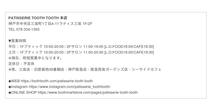 お菓子づくりへ情熱を注ぐ職人たちの"こだわり"と、私たちが大好きなアートやモード、音楽といった"遊び心"がマリアージュした、神戸の洋菓子屋。神戸に新しい風を吹かせた「トゥーストゥース」。心地よい音楽が流れる賑やかなお店で、みんながお目当てにしたのが、四季の移ろいをあしらった果実たっぷりのタルトと、しっかり焼きこんだ素朴なお菓子たちでした。1997年に洋菓子の専門店として生まれた「パティスリートゥーストゥース」は、開業以来、美味しいもの好きな神戸っ子たちに喜んでいただけるよう、丁寧に、ときにはやんちゃに、"こだわり"と"遊び心"を重ねています。