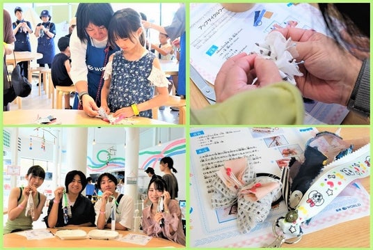 左上)先だって7月に開催したワールドグループ社員の家族に向けたワークショップ 右上)ヘアアクセサリー「フラワーシュシュ」は重ねた布を丁寧に開き花の形に 左下)全世代が楽しめる遊園地ならではの企画 右下)およそ30分で完成!タッセルはバッグに付けたり、ヘアアクセサリーは腕にブレスレットの様にしたりと自由にアレンジ