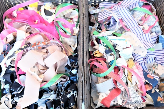 材料には、ワールドの自社工場でシャツやワンピースなどの縫製時に出た残布や、二次流通で価格が付かなかった服を解体した色とりどりの端切れや糸を取り揃えました。服に使われる様々な素材の違いにも触れて、自由に楽しく選びながらものづくりを楽しんでいただきました。