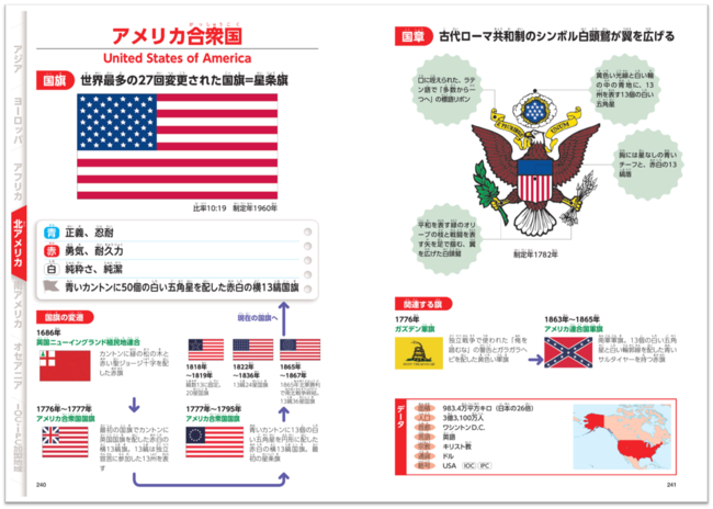 国旗が変わる経験を持たない我々日本人には気付きにくいことですが、海外の国旗は革命や政権交代などにより頻繁にデザインが変わっています。例えば、アメリカ合衆国はこれまで27回も国旗が変わっており、これは世界最多の記録です。本書では、その国がどこに位置した国なのか、すべての国・地域の場所を地図で明示。面積・人口・首都・言語・宗教・通貨・略号などの基本データも収録しています。また、2019年に行われた「北マケドニア共和国」の国名変更や「カザフスタン」の首都名変更にも対応している「最新版」です。